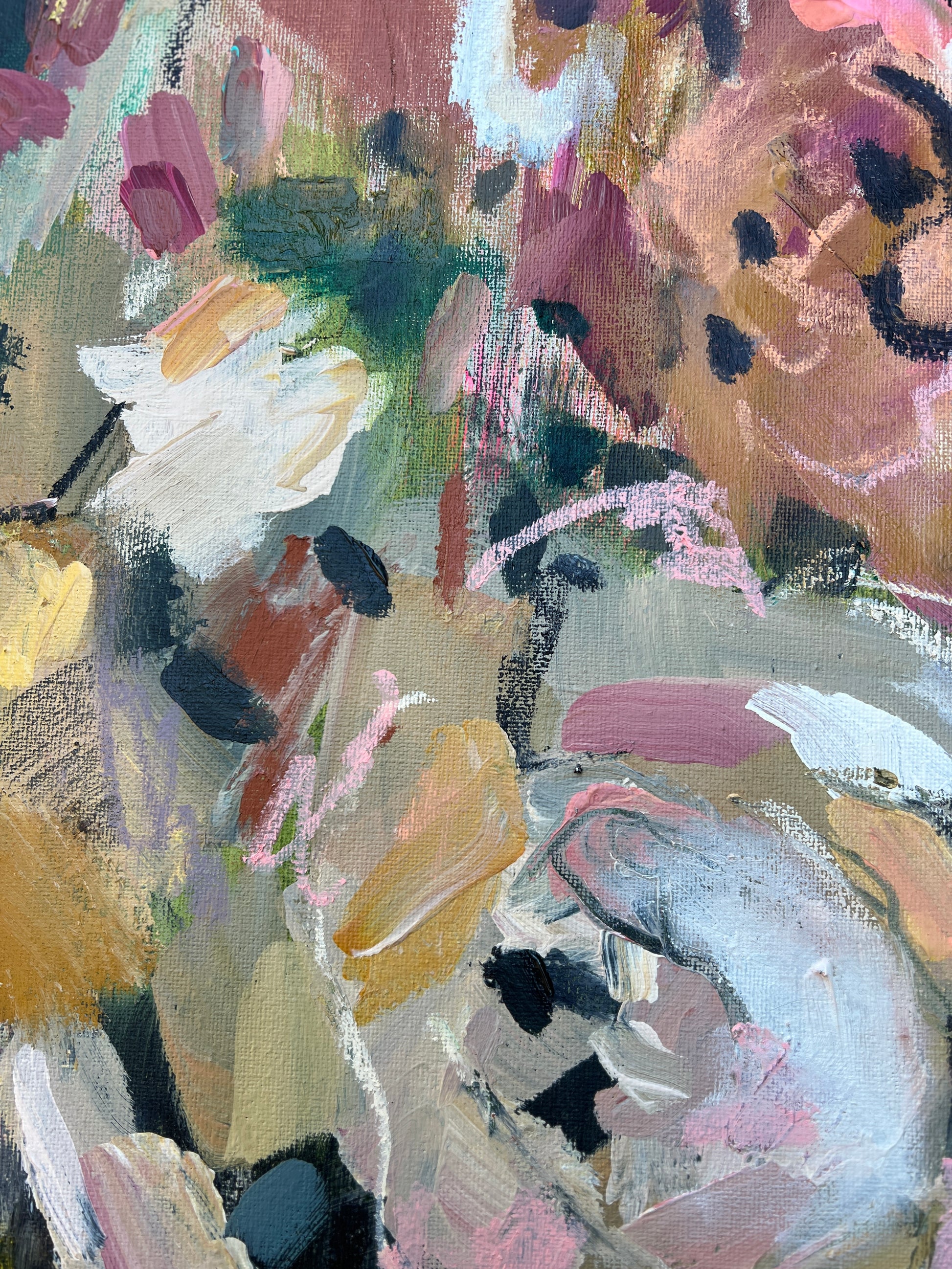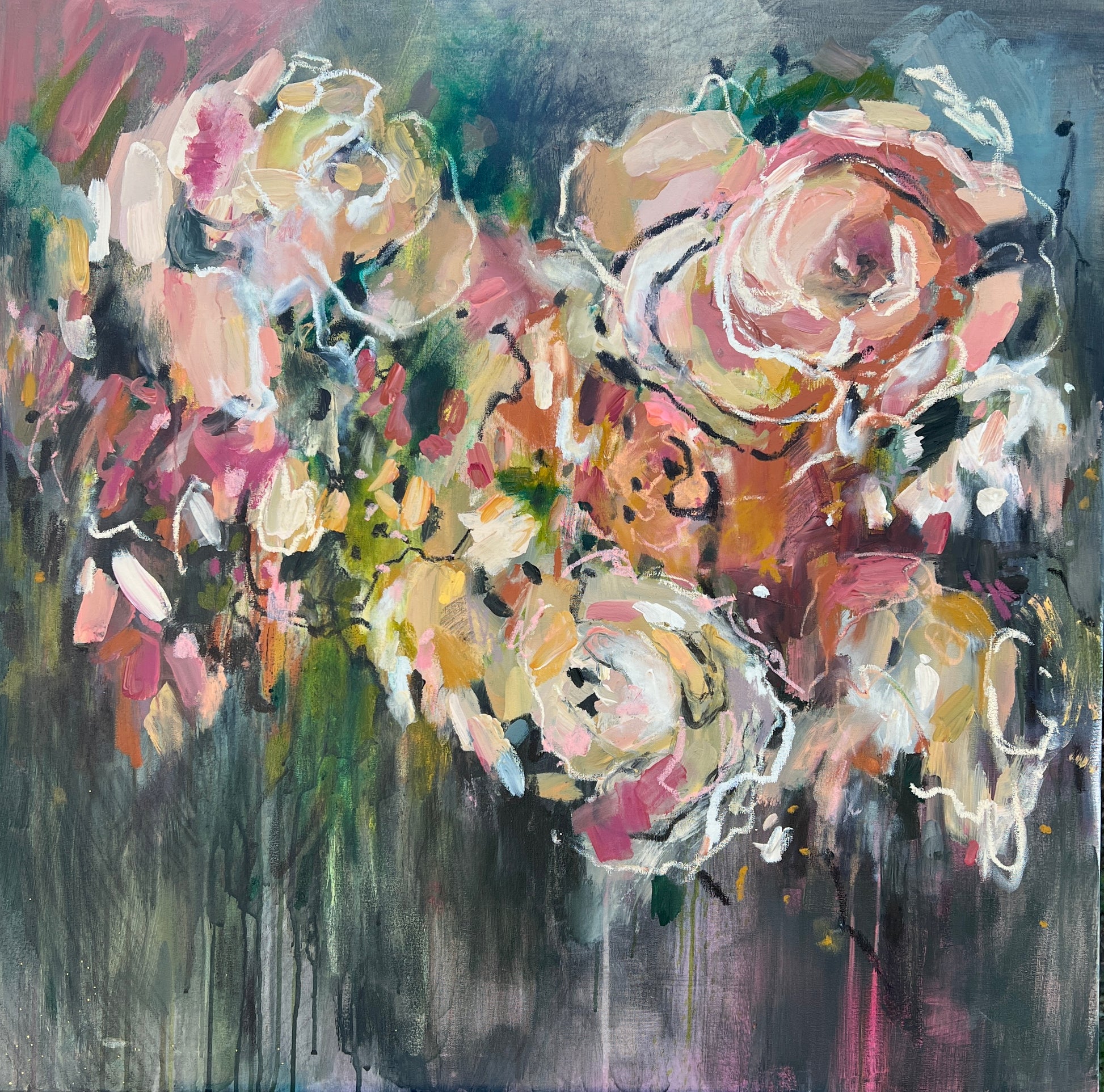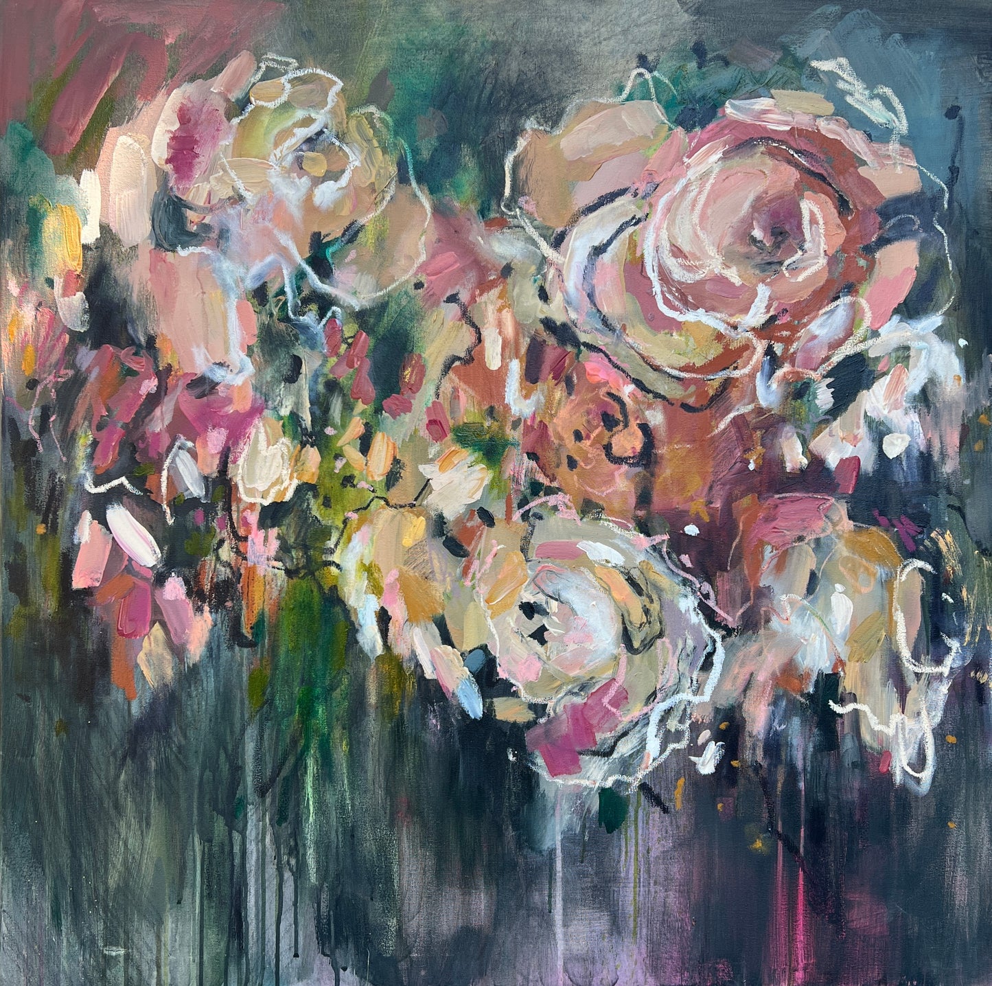 "Dusk In Bloom" within the emotional highs (the blooms) of relationships, there are deeper feelings and shadows that need to be acknowledged, and it's reflected in the use of black and soft colors