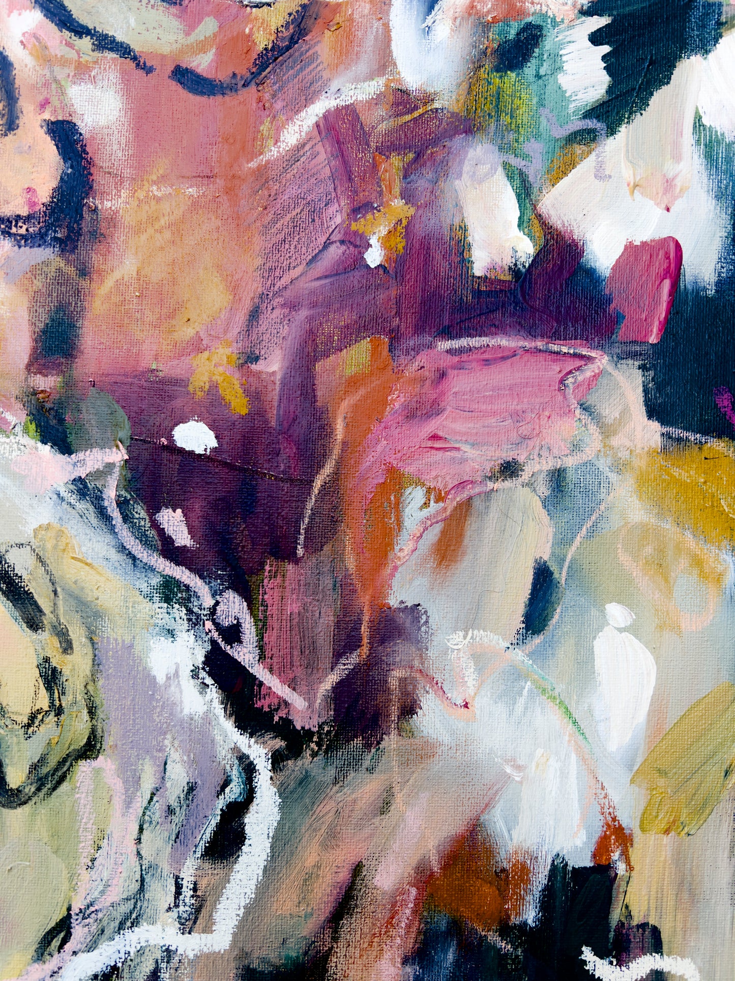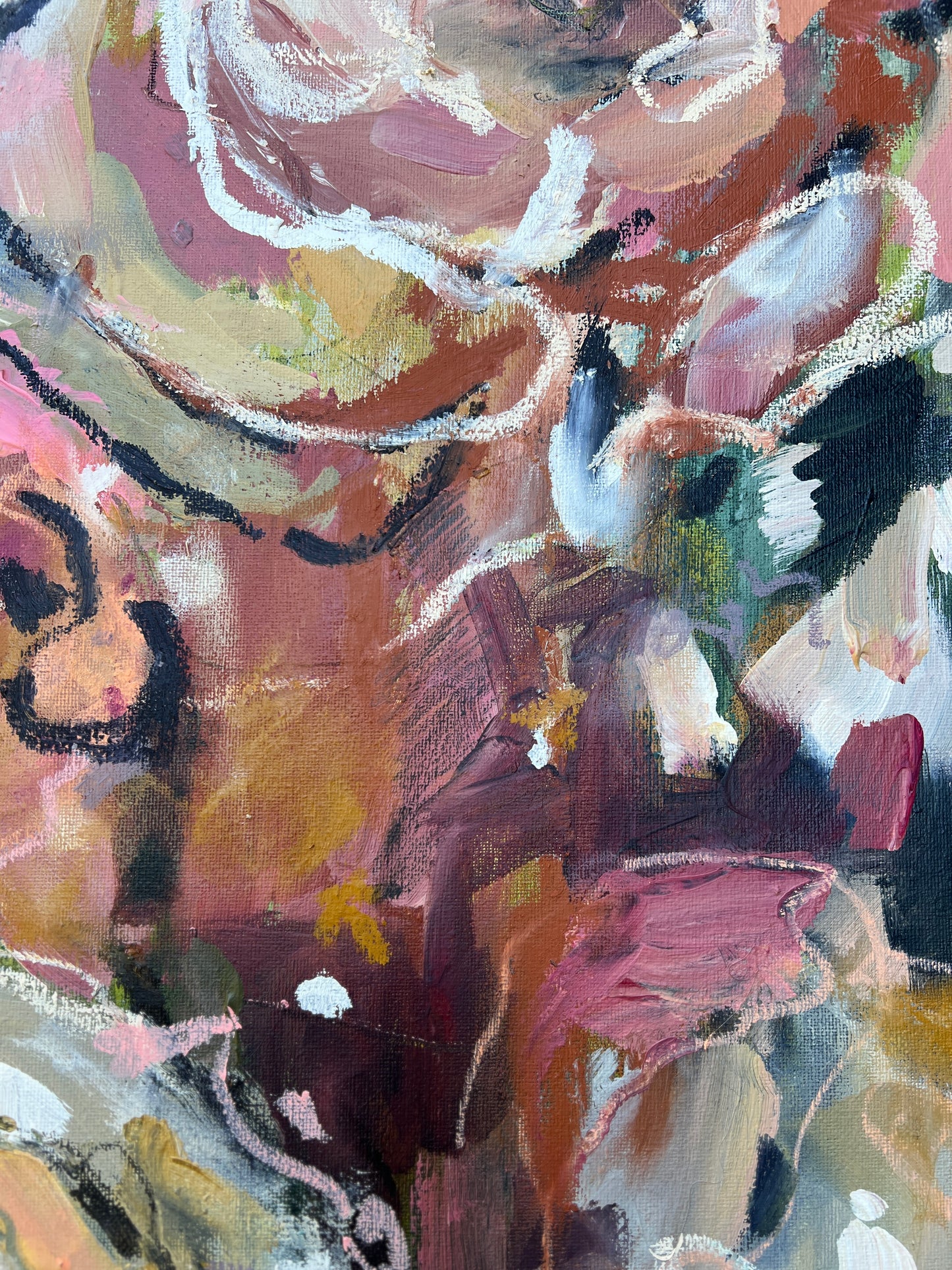This painting is 36"x36" and is made with oil, acrylic, charcoal, and pastel on stretched canvas.