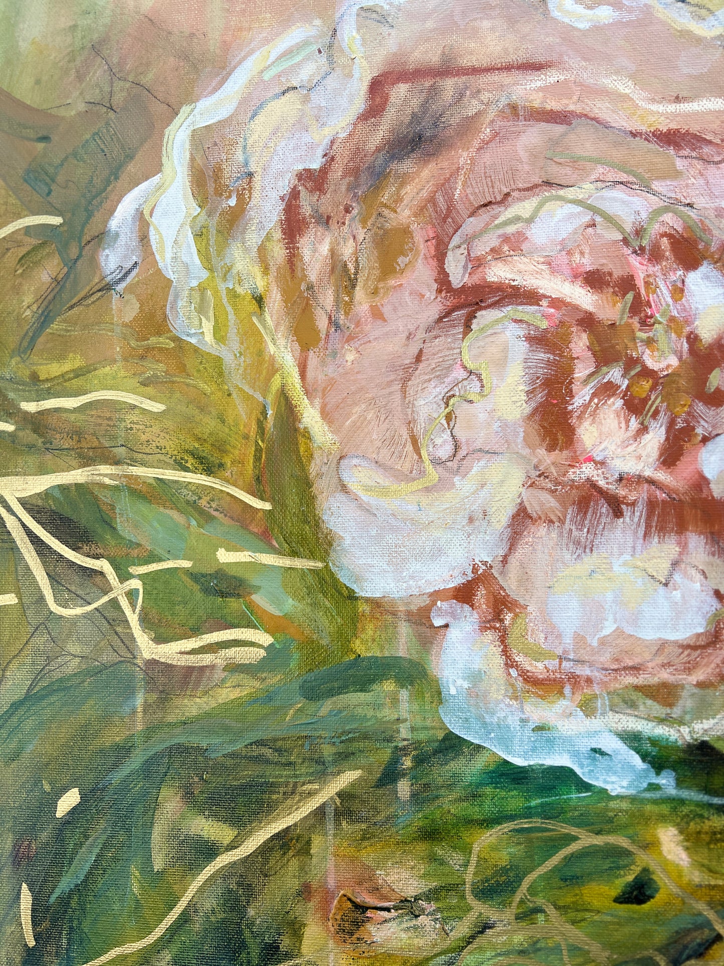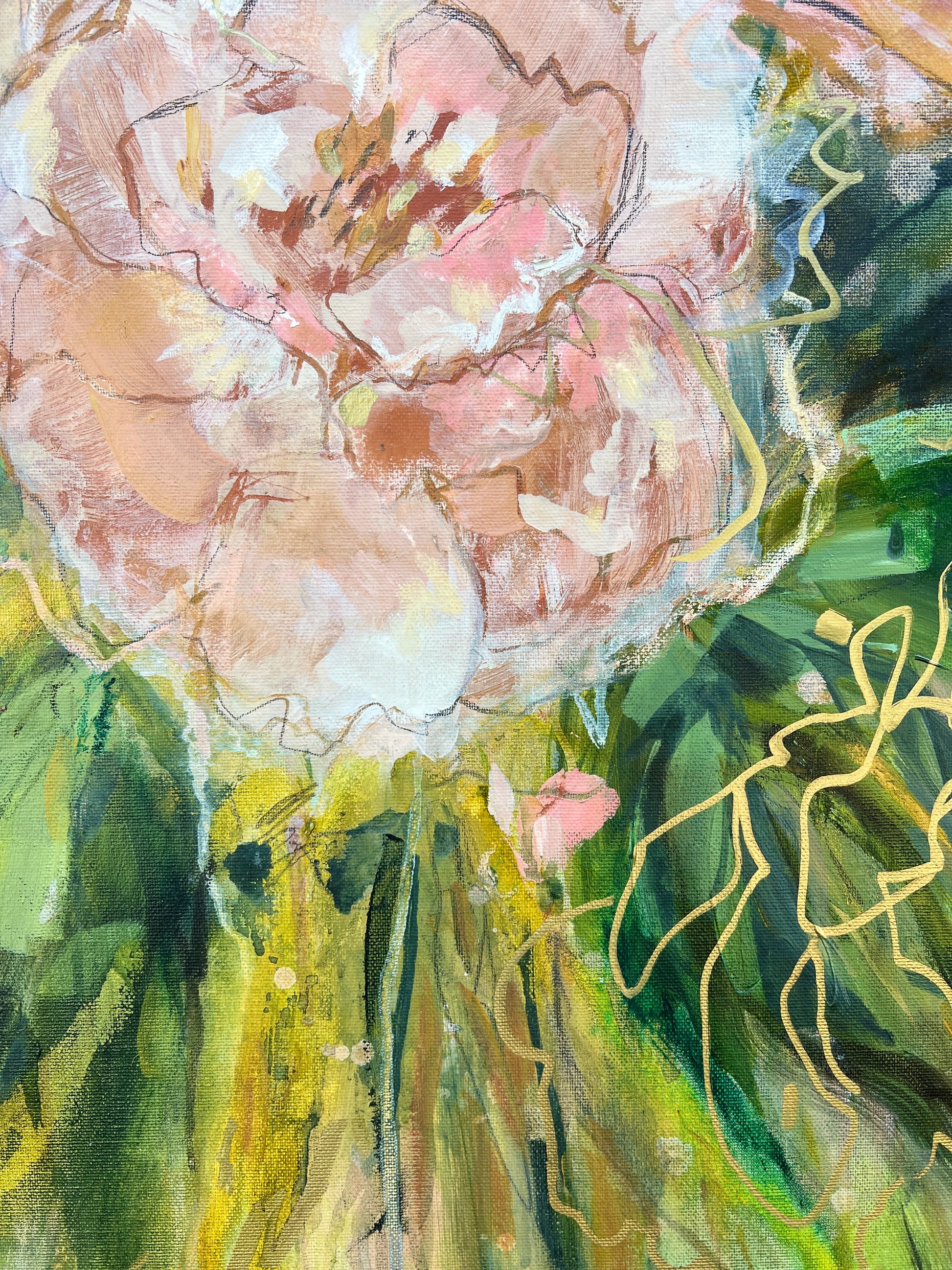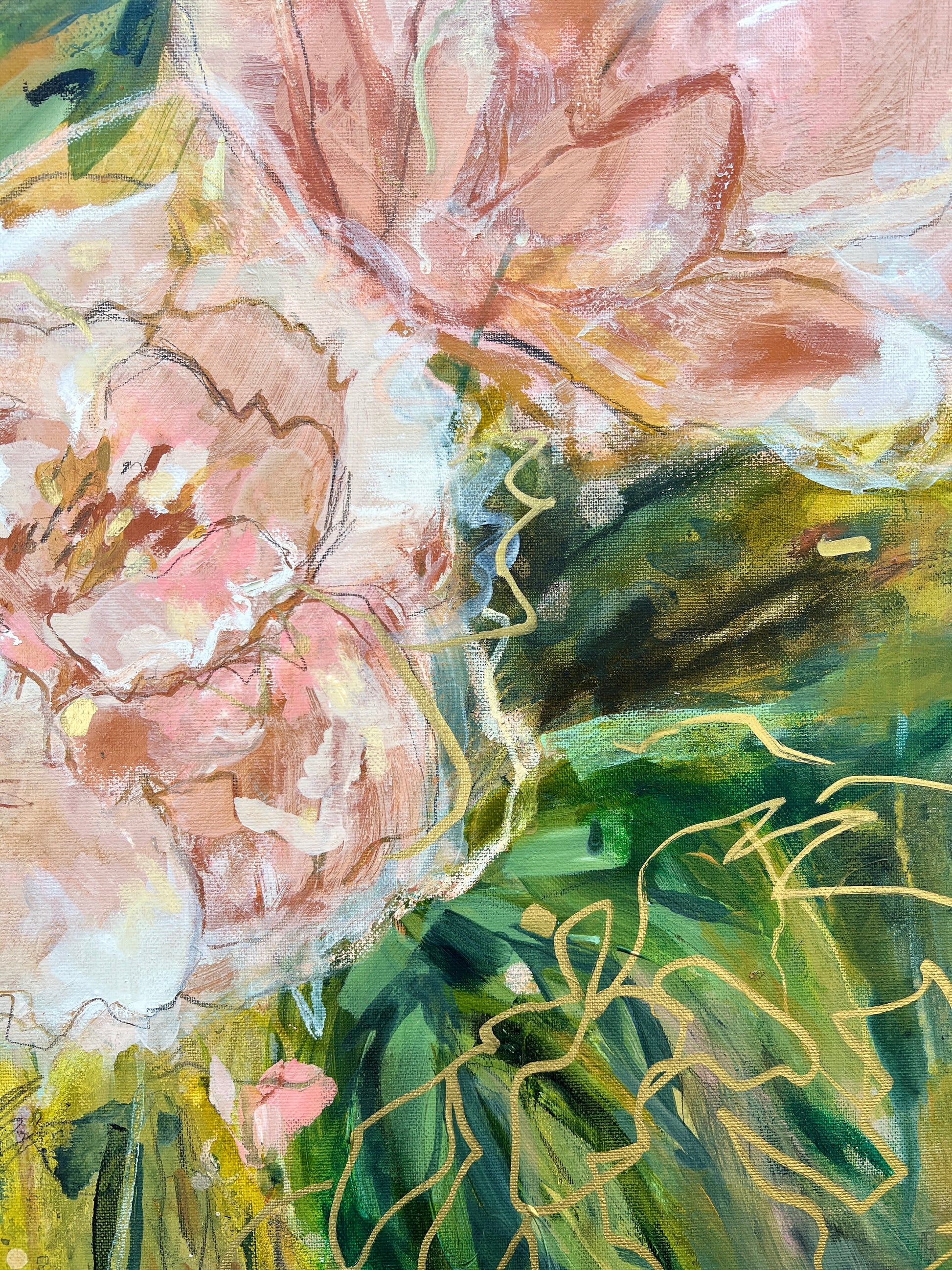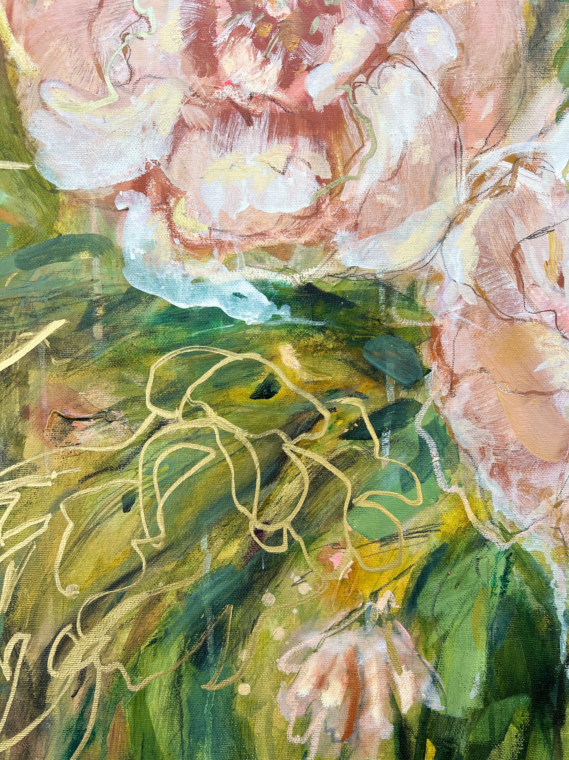 The term "Ghost" symbolizes the fleeting nature of romance and attraction, much like the delicate and transient beauty of flowers. It reflects how relationships can be vibrant and alive one moment and then fade into memories. The juxtaposition of the bright pinks and greens with the gold outlines reflect the contrast between passion (love and lust) and the constraints that control imposes. While love can be beautiful, it can also be complicated and sometimes painful when control becomes a factor. It also implies memories of past loves—those lingering feelings that haunt us. It speaks to how unresolved issues in relationships can leave a mark, influencing new beginnings and our capacity to trust again.