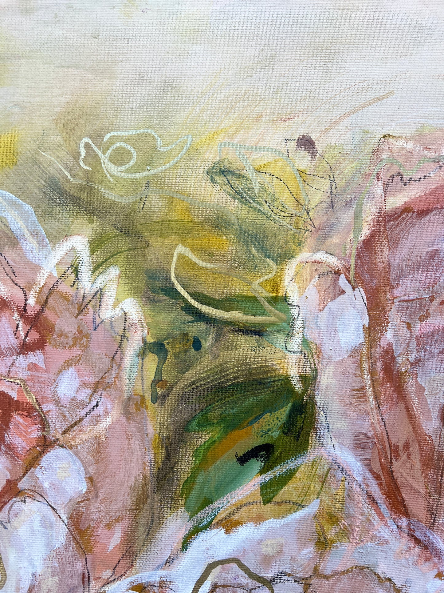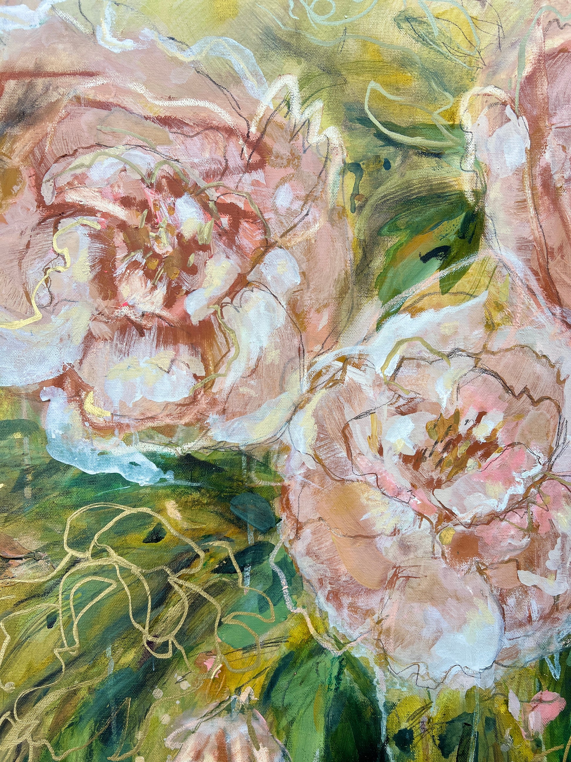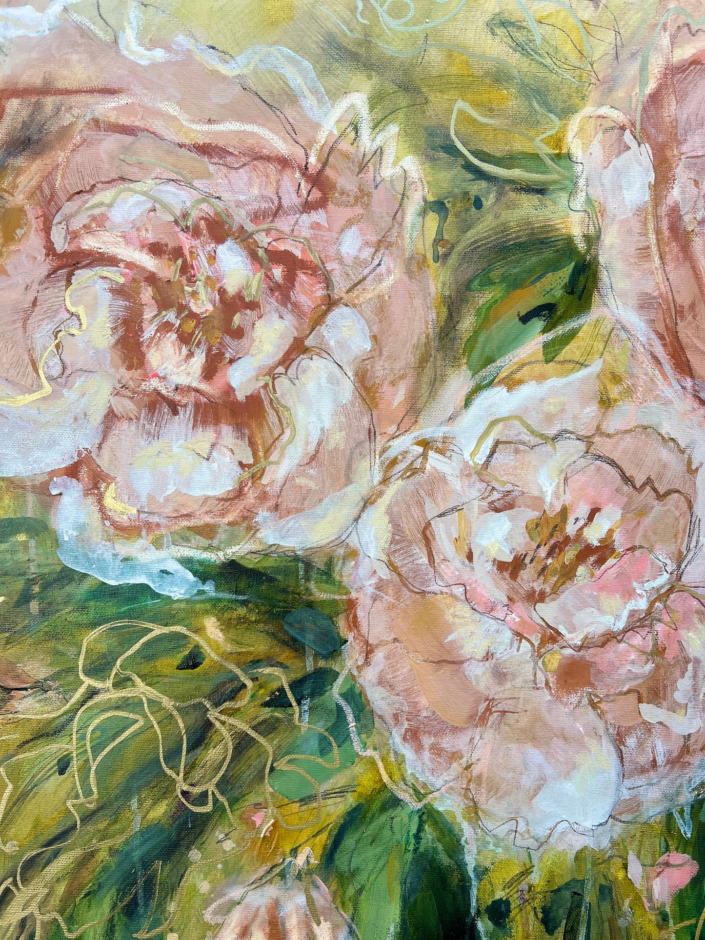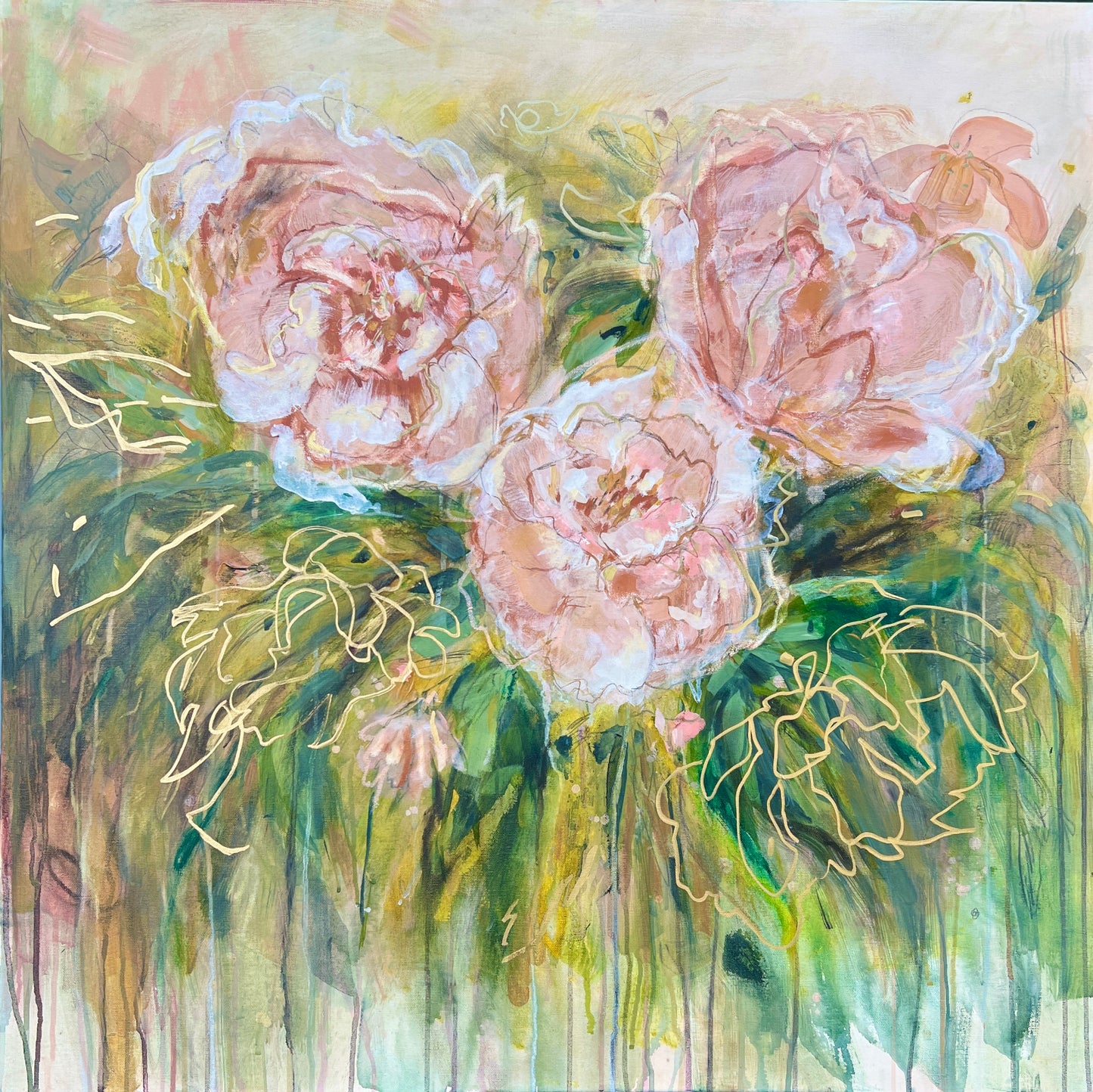 The term "Ghost" symbolizes the fleeting nature of romance and attraction, much like the delicate and transient beauty of flowers. It reflects how relationships can be vibrant and alive one moment and then fade into memories. The juxtaposition of the bright pinks and greens with the gold outlines reflect the contrast between passion (love and lust) and the constraints that control imposes. While love can be beautiful, it can also be complicated and sometimes painful when control becomes a factor. It also implies memories of past loves—those lingering feelings that haunt us. It speaks to how unresolved issues in relationships can leave a mark, influencing new beginnings and our capacity to trust again.