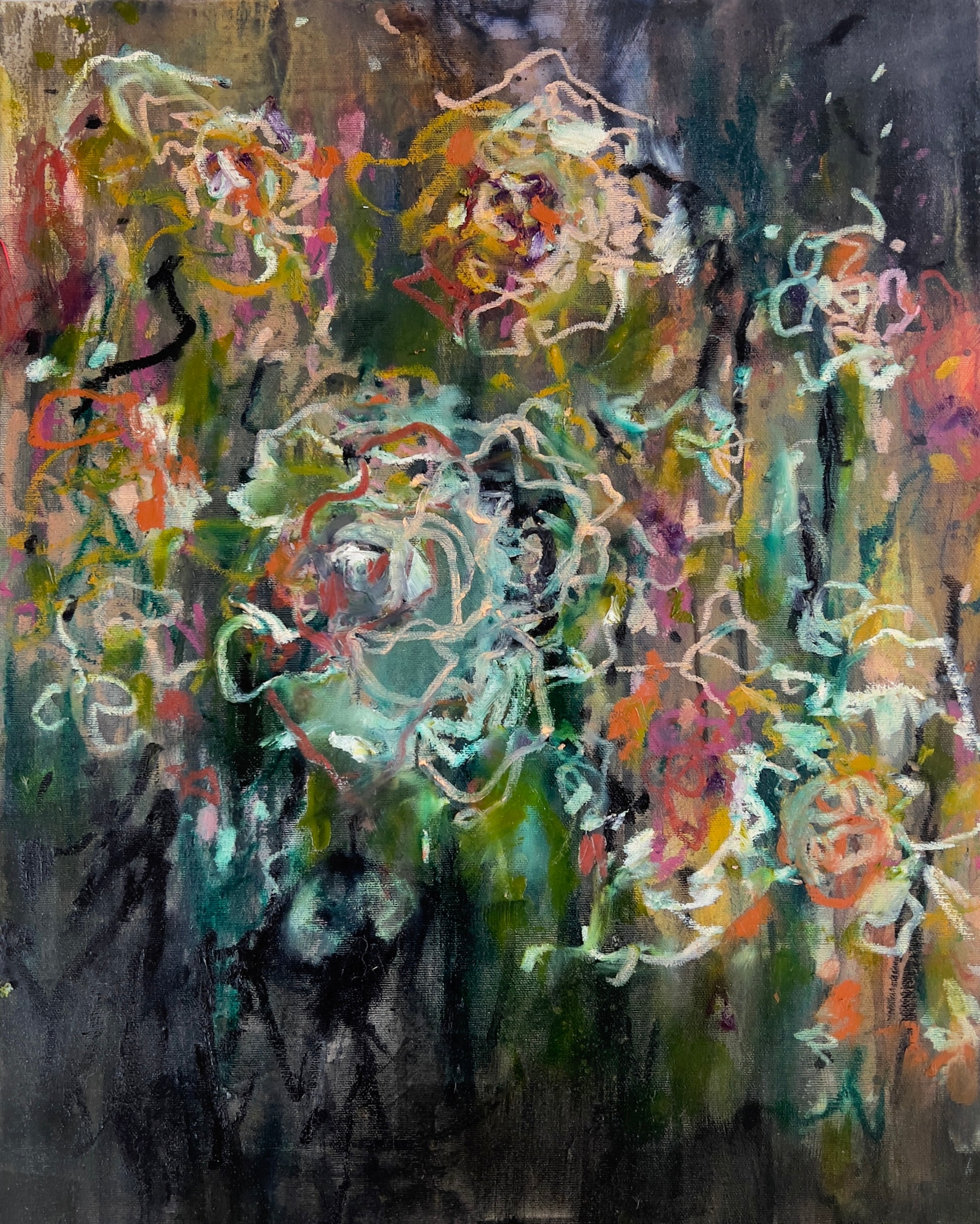 Colourful petals dance on a dark background in this 16"x20" painting.